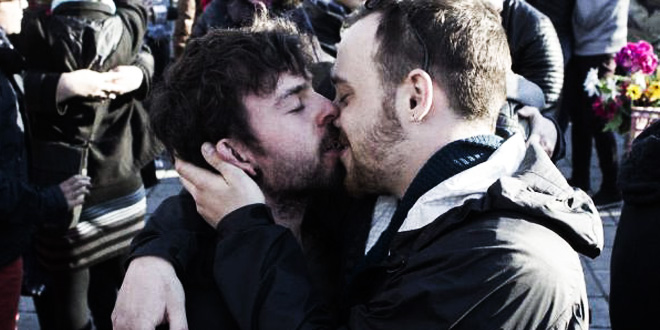 Geçiğimiz hafta Kanada’nın Montreal şehrinde yaşanan homofobik saldırıyı protesto etmek isteyen yüzlerce insan, saldırının gerçekleştiği Hochelaga-Maisonneuve’de eşcinsel öpüşme protestosu gerçekleştirdi.